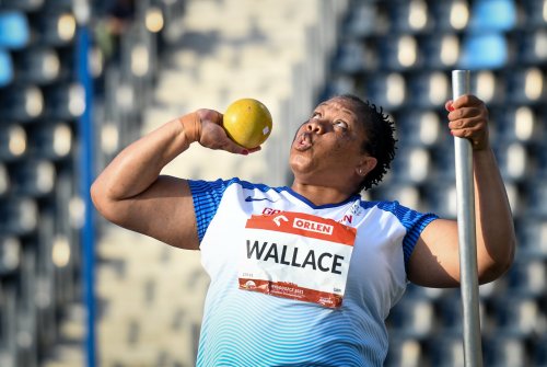 Vanessa Wallace sits and holds on as she puts the shot, photo by IPC