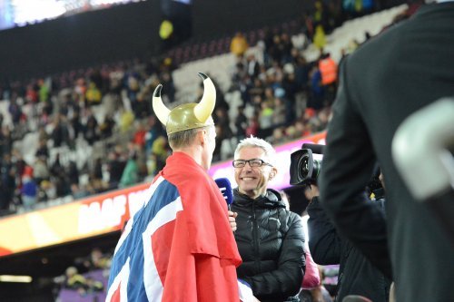 Karsten Warhlom with an incredulous Jonathan Edwards, London 2017, photo by Martin Bateman