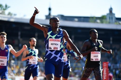 Ferguson Rotich, with that nodding finger, after a big win, photo by Diamond League AG