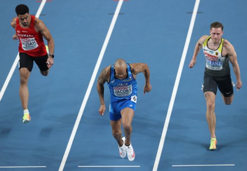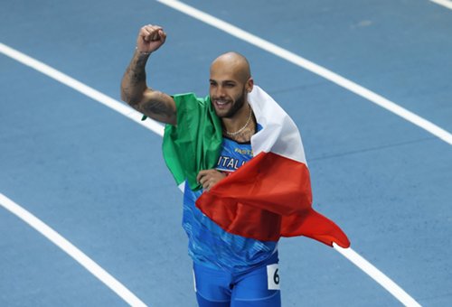 Lamont Marcell Jacobs, 2021 Olympic 100m champion (shown here winning the 60m 2021 European Indoor title), photo courtesy of European Athletics / Getty Images