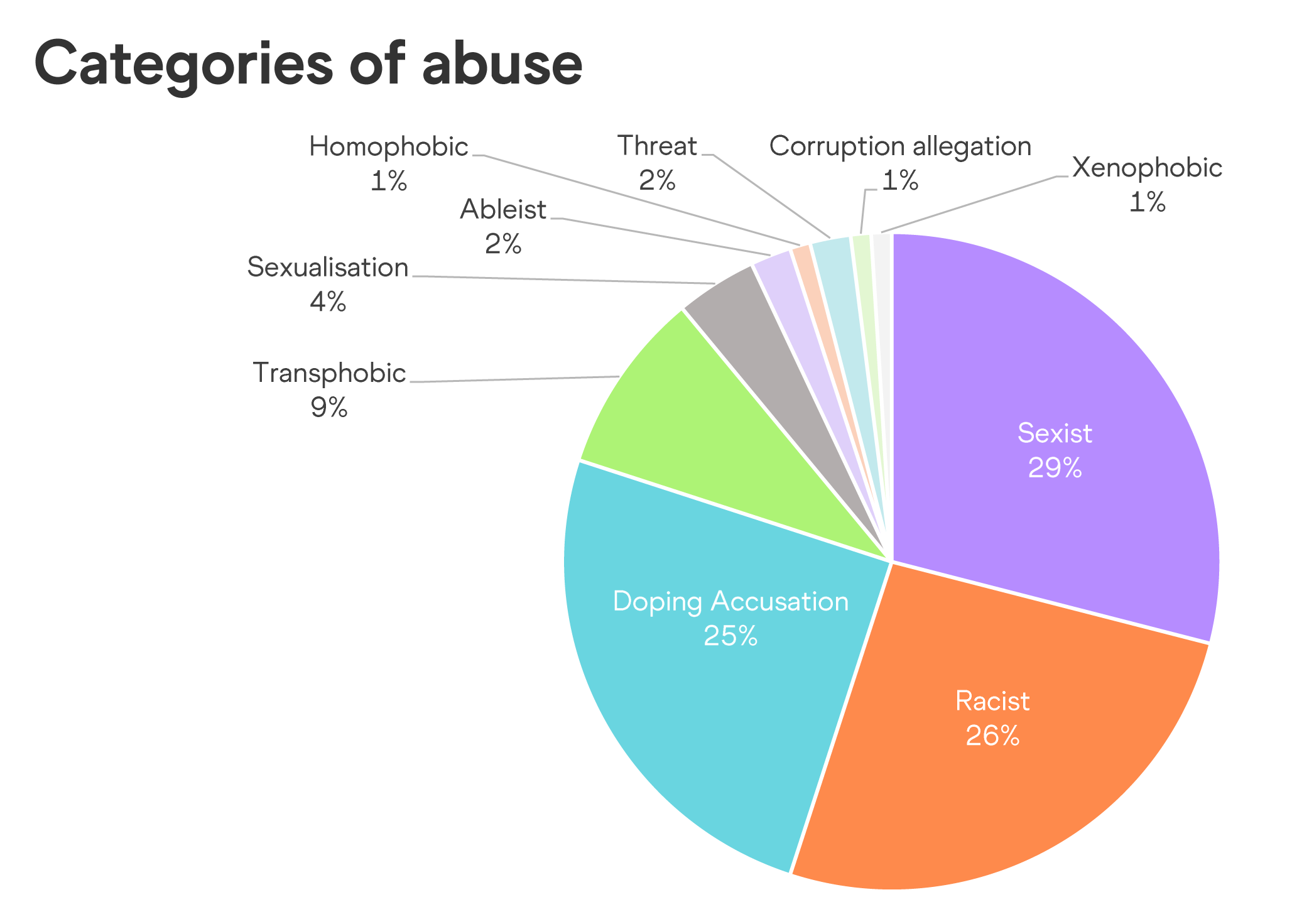 Unfounded doping accusations made up 25% of abusive messages, while 10% consisted of transphobic (9%) and homophobic (1%) posts.