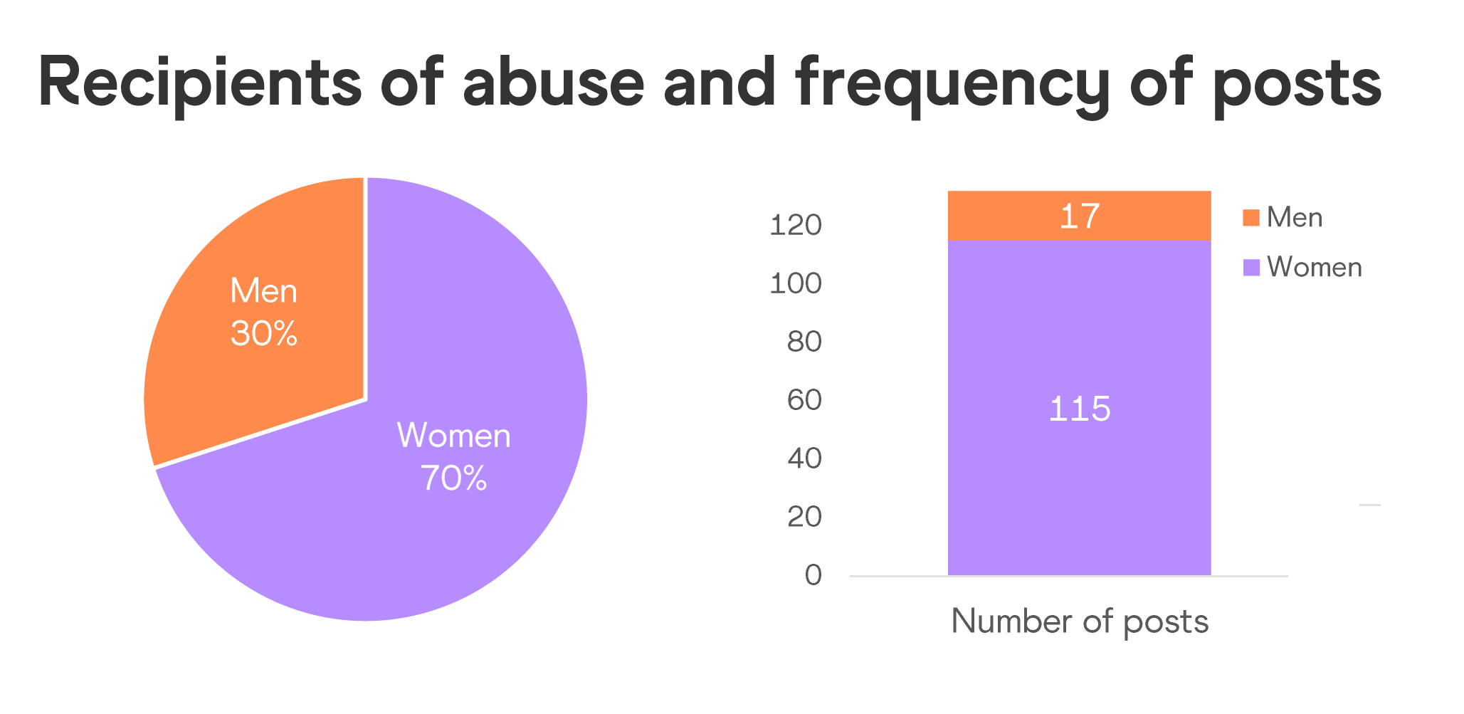 - Out of the 23 athletes who received abuse, 16 were women with 115 of the 132 identified abusive posts directed at female athletes.