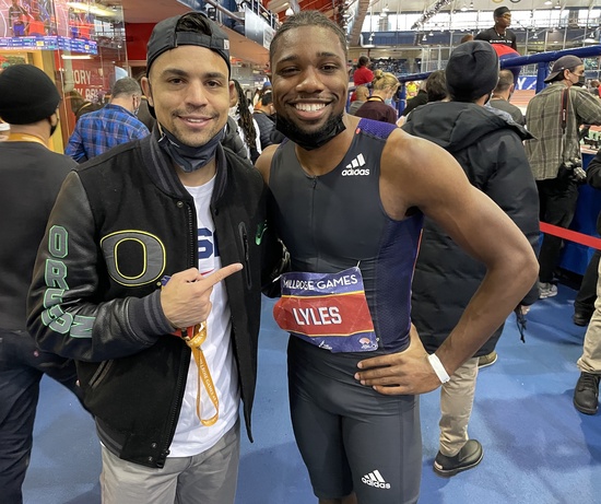 Matt Centrowitz and Noah Lyles, 2022 Millrose Games, photo by Jeff Benjamin