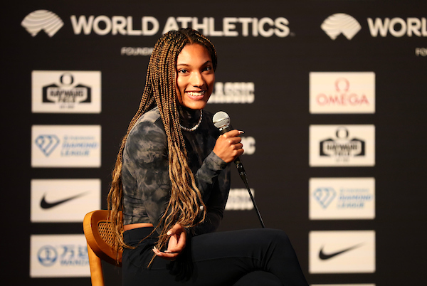 Tara Davis, 2022 Nike Pre Classic presser, photo by Kevin Morris / @kevmofoto