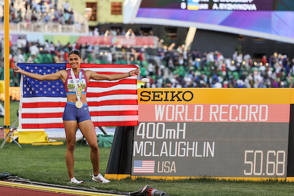 The Dunellen, NJ dazzler’s 50.68 triumphs at the World Championships Saturday was stunning. It smashed her previous world of 51.41 set at the USA Olympic Trials at this same venue by a huge 0.73 seconds, which in turn had bettered her own world mark of 51.46 set at the 2021 Tokyo Olympic Games.