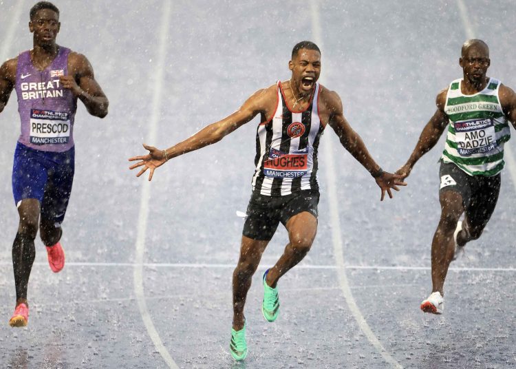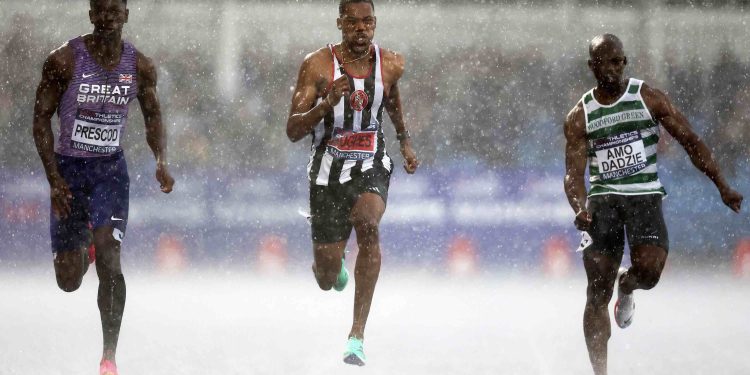 The rainy 100m, Reece Prescod, Zharnel Hughes, and Eugene Amo-Dadzie, the world’s fastest accountant (he’s in Green kit), photo by Getty Images for British Athletics