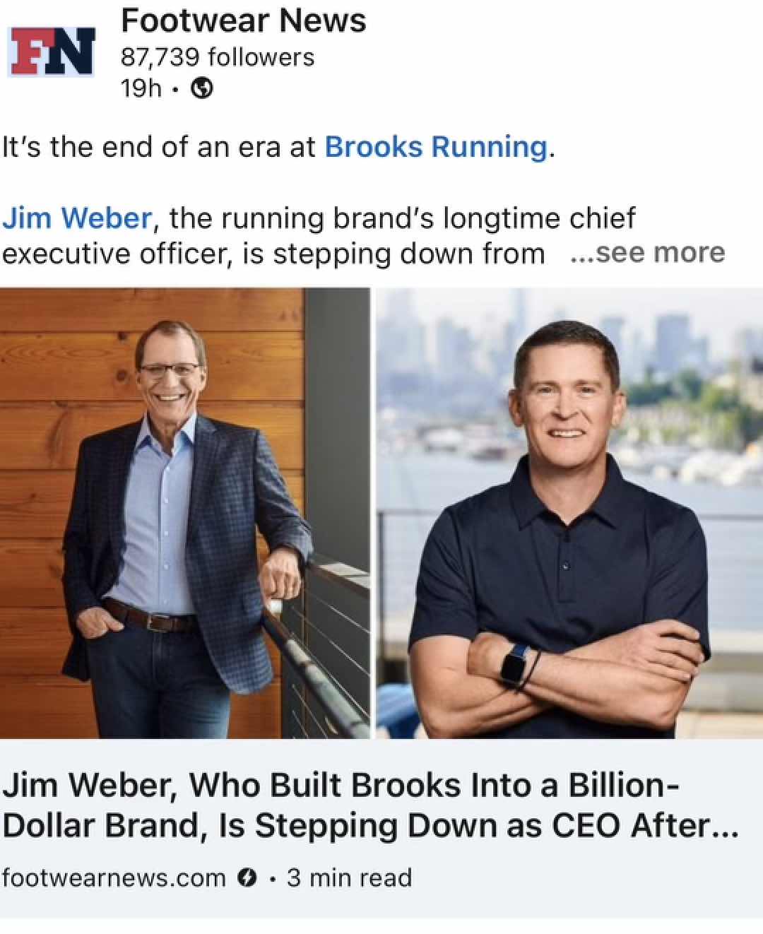 Jim Weber joined Brooks in 1999 and was named CEO in 2001. He has led the brand for 23 years, growing it from $100 million to $1.5 billion in sales. Now, he is stepping down, as Dan Sheridan is moving to CEO. Matt Dodge, who managed the Europe/Middle East and Asia business, is moving to COO.