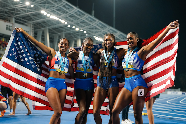 USA’s women’s 4x400m team (Quanera Hayes, Gabrielle Thomas, Bailey Lear, and Alexis Holmes) put in another dominant performance, staying clear ahead of the rest to win the world title and a fourth gold medal for their country in a world-leading 3:21.70. Poland came in second, ahead of Canada.