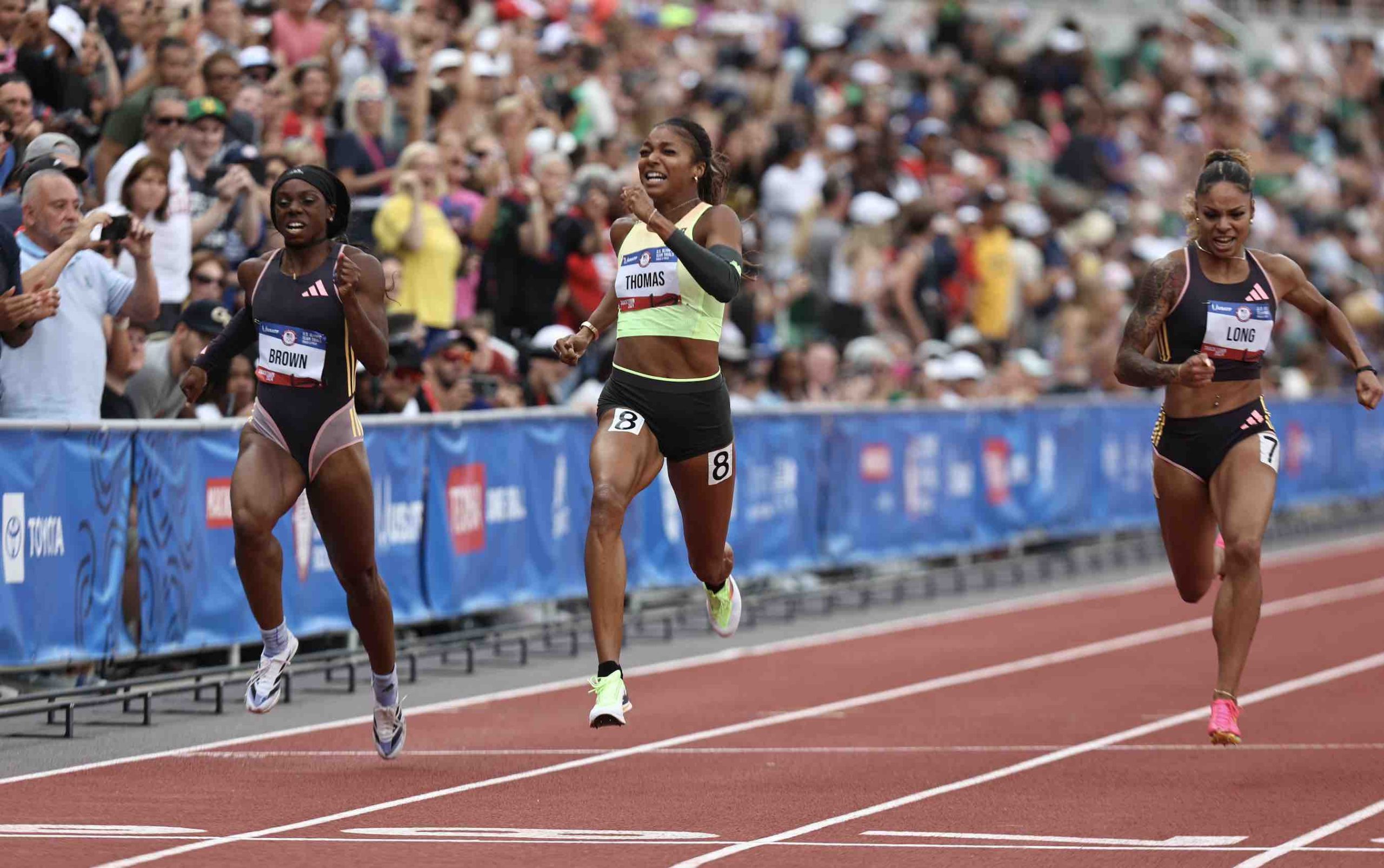 As Long came around the curve, she was behind Thomas and Brown. Sha’Carri Richardson was on her hip. For a moment, it looked as if she would gain enough ground to surpass Long, but she couldn’t do it.