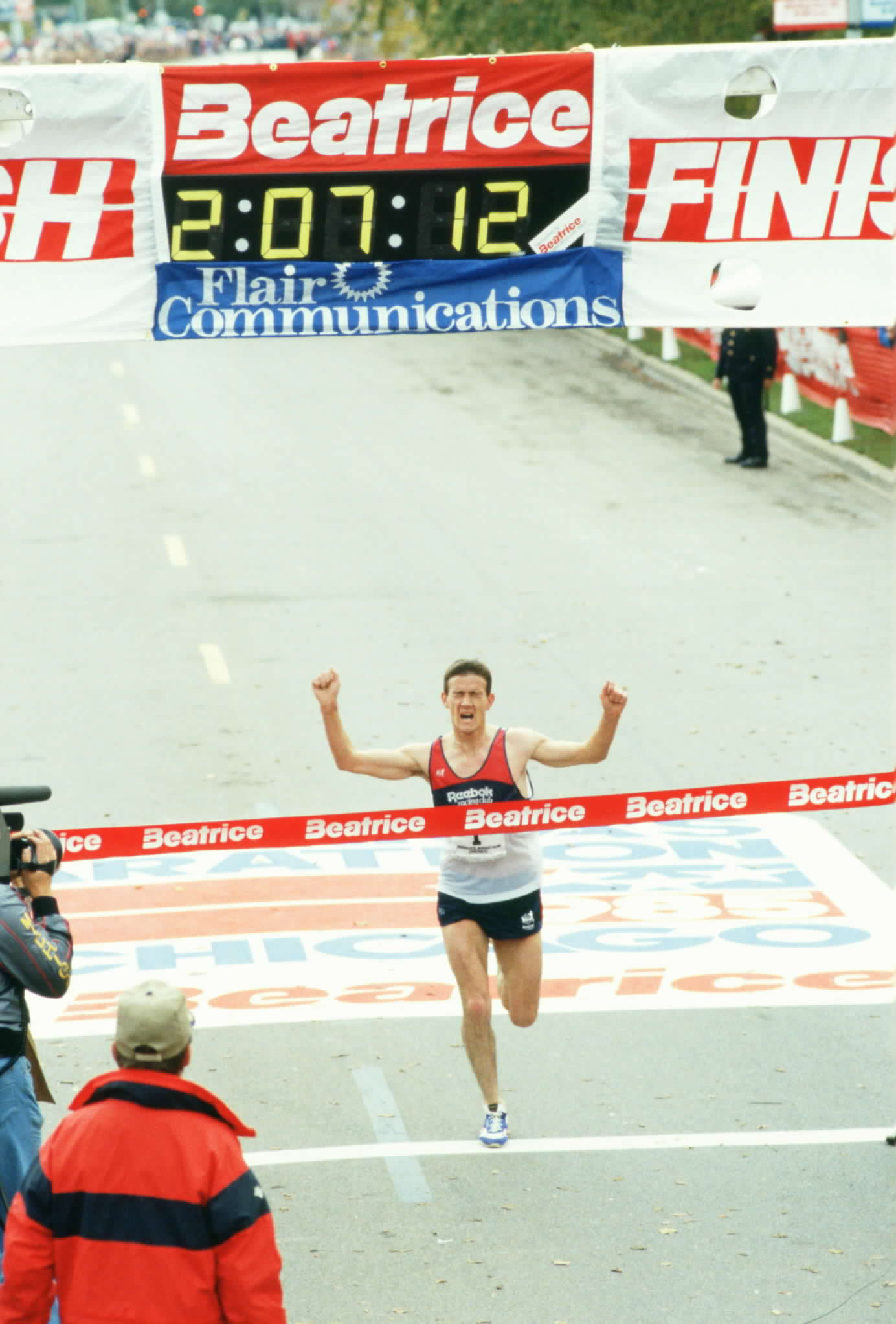 Jones’s goal was to regain the World Record (which he set in Chicago in 1984), but he missed Carlos Lopes’ current standard by just one second. His victory earned him $35,000 for winning, $10,000 for setting the new course record and $13,000 in time bonuses for running under 2:08