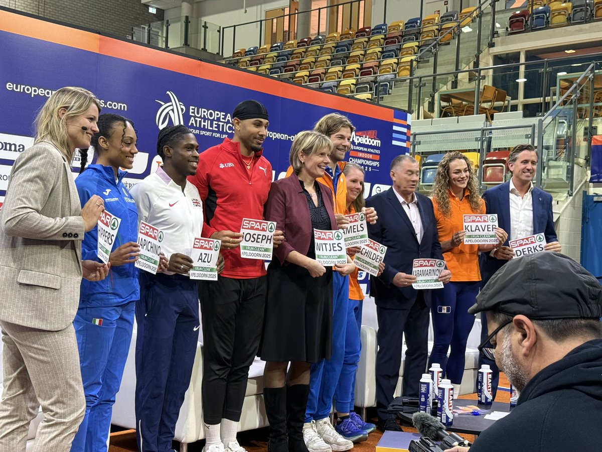 6. The six athletes at presser were Lieke Klaver, the Netherlands, 400 meters, 4x400m and perhaps Mixed relay, Jessica Schindler, the Netherlands, two time European shot put (outdoor ) champion, who wants to do well in Apeldoorn, Douwe Amels, the Netherlands, two time European indoor HJ gold medalist, would love to win in front of home country, Jason Josesph, Swiss high hurdle star, Jeremiah Azu, GBR, British 60 meter champion, and Larissa Iapichino, Italy, silver medalist, European Champs, LJ, whose mother won two Olympic silvers, two World Champ golds for Italy!