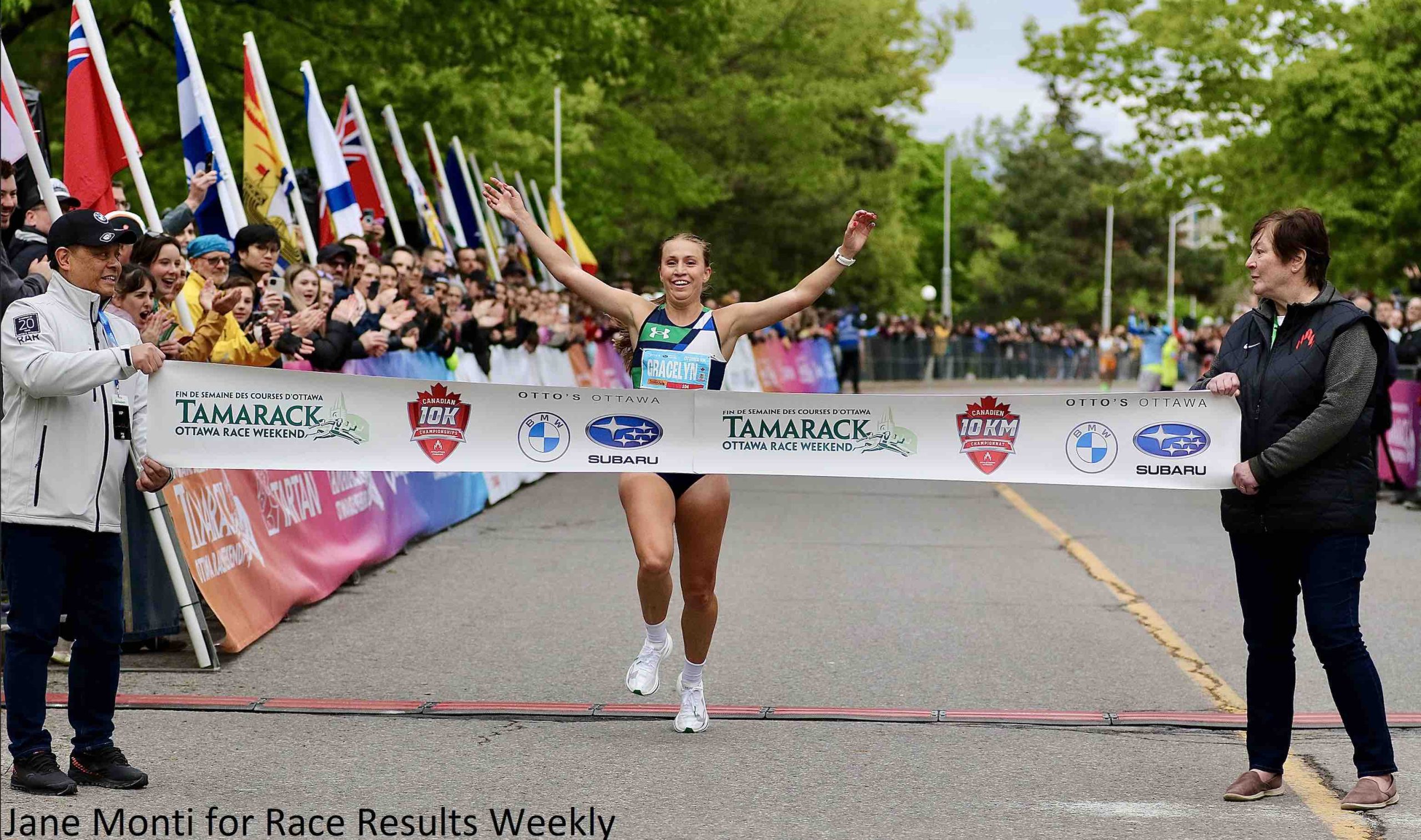 OTTAWA (24-May) — On a cloudy and chilly evening here in the Canadian capital, Gracelyn Larkin and Charles Philibert-Thiboutot won the Athletics Canada 10-K road running championships in exciting races. Larkin, 24, running in only her second road 10-K, came from behind to pass early leader and defending champion Malindi Elmore and break the tape on Queen Elizabeth Driveway in 32:43. Philibert-Thiboutot, 34, broke away from marathoner Cam Levins in the ninth kilometer to win in 28:06, a new Canadian record. Both athletes won CAD 6000 in prize money.