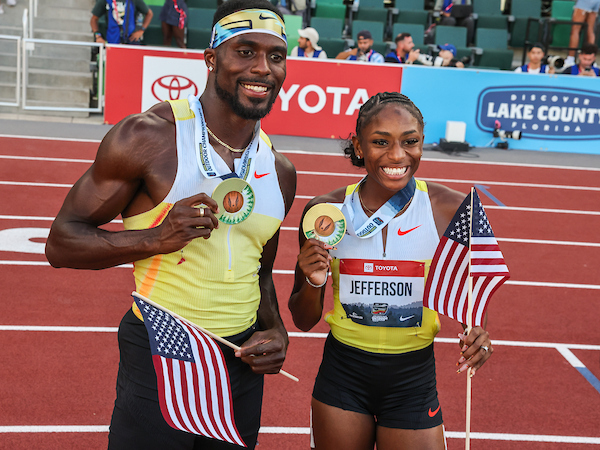 Kenny Bednarek, Melissa Jefferson-Wooden, 100 meter winners, USATF Outdoor Track & Field Championships Eugene, Oregon, USA July 31 – August 3, 2025, photo by Kevin Morris