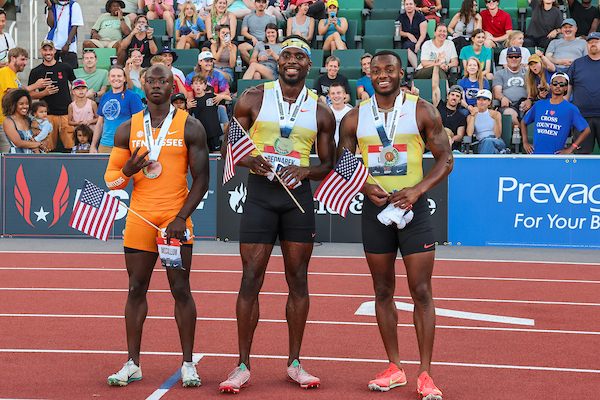 The Men’s 100m final top 3, USATF Outdoor Track & Field Championships Eugene, Oregon, USA July 31 – August 3, 2025, photo by Kevin Morris