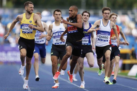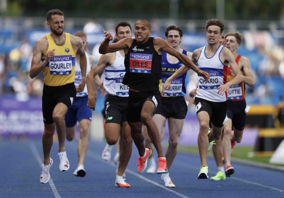 Gourley and Giles were on paper 5 seconds faster than the rest of the field, so the outcome seemed never in doubt. Giles would have had unpleasant memories of last year’s trials when he and Josh Kerr had a clash of legs within meters off the finish line in the 800, leaving him out of the Paris Olympics until he got a late call-up to replace Jake Wightman. This year, the race went as expected until the last 3 meters, when Gourley and Giles collided legs and Giles almost went down again (see photo).
