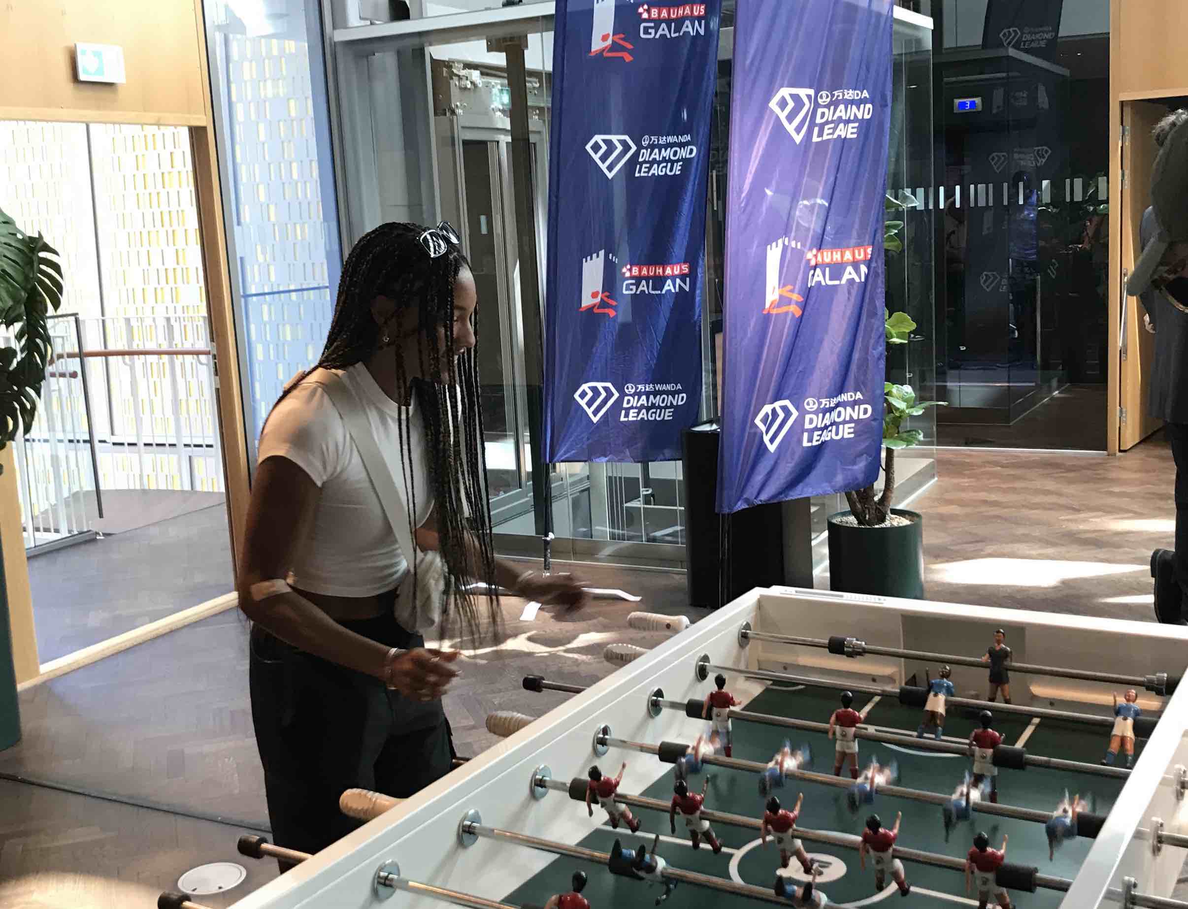 Tara Davis-Woodhall, and Table Football, photo by Stuart Weir