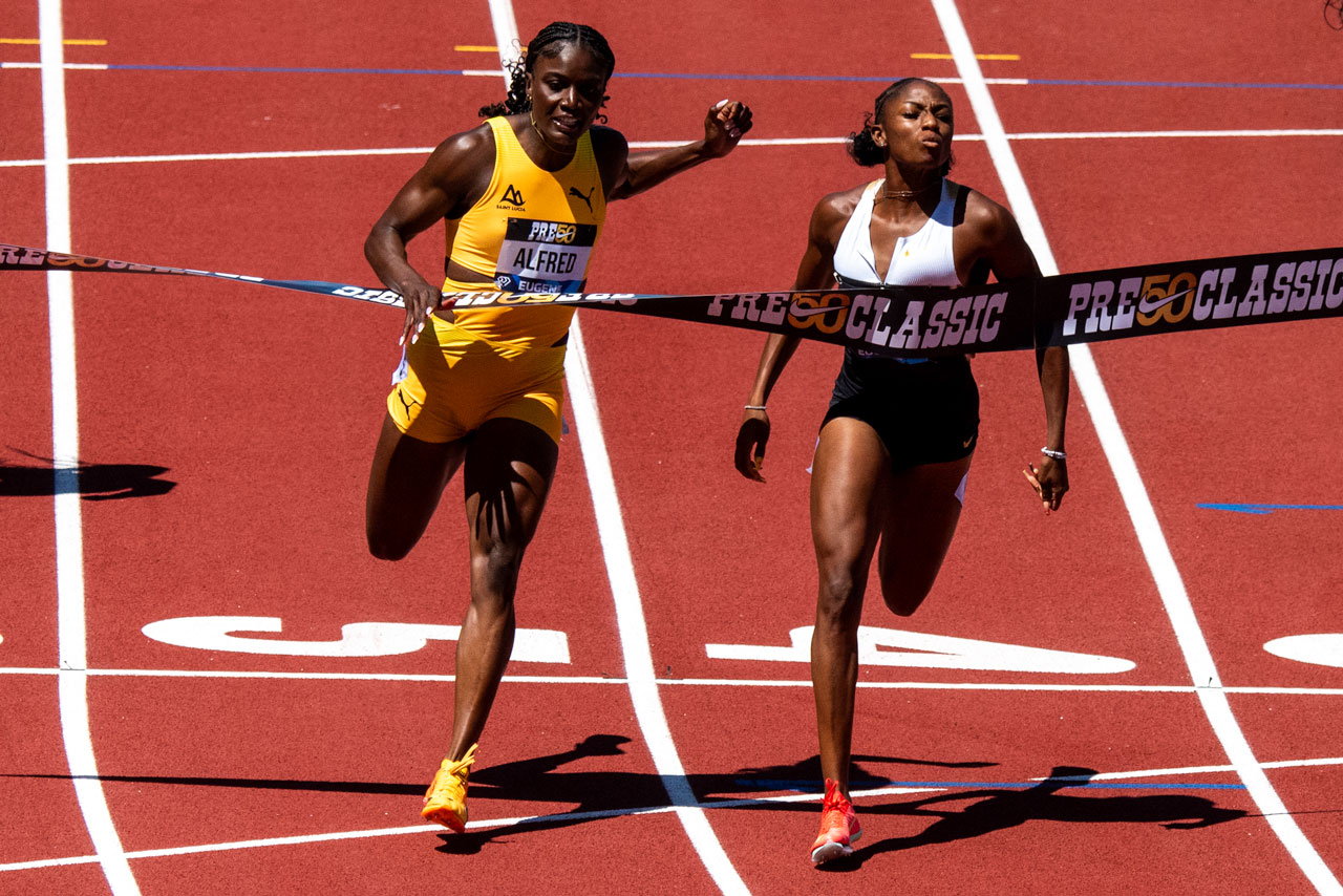 Melissa Jefferson-Wooden defeats Olympic champ, Julien Alfred, NIKE Pre Classic, photo by Brian Eder for RunBlogRun