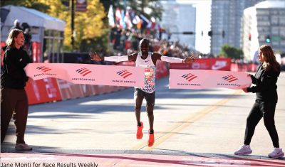 CHICAGO (12-Oct) — Uganda’s Jacob Kiplimo and Ethiopia’s Hawi Feysa dominated today’s 47th Bank of America Chicago Marathon, recording fast winning times of 2:02:23 and 2:14:56, respectively. Kiplimo, 24, running in only his second marathon, was on world record pace through 35-K, but slowed in the final kilometers and had to settle for the win and the second-fastest time ever at Chicago. He was also the race’s first Ugandan winner. Feysa, 26, ran nearly identical halves of 67:30 and 67:26 to set a personal best of 2:14:56 and got her first-ever Abbott World Marathon Majors title. Both winners won $100,000 in prize money.