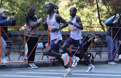 Moments after entering the park, Kipruto put in the race’s most important surge. Korir and Dever were dropped, but Mutiso stayed with his adidas teammate. Kipruto ran the 25th mile in 4:30, the fastest of the race. That set up an incredible battle for the win after the two leaders re-entered Central Park with about 600 meters to go. Kipruto was leading, and it seemed as if he had a big enough gap to claim a clear victory. But Mutiso mounted an surprising final sprint, running on Kipruto’s left.