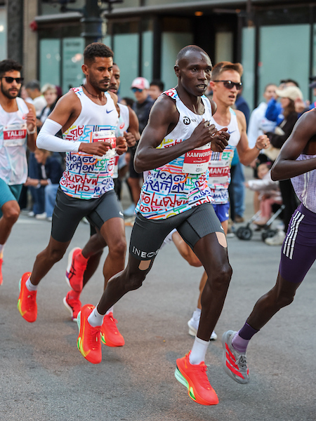 Kamworor was greeted at the finish by his training partner and mentor, Eliud Kipchoge, the World Record holder in the Marathon (at the time). “I didn’t want to disappoint him,” Kamworor said. “That gave me a lot of motivation.”